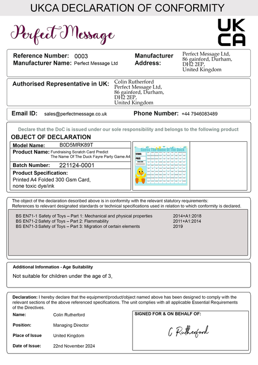 Fundraising Scratch Card Guess The Name Of The Duck Fayre Party A4