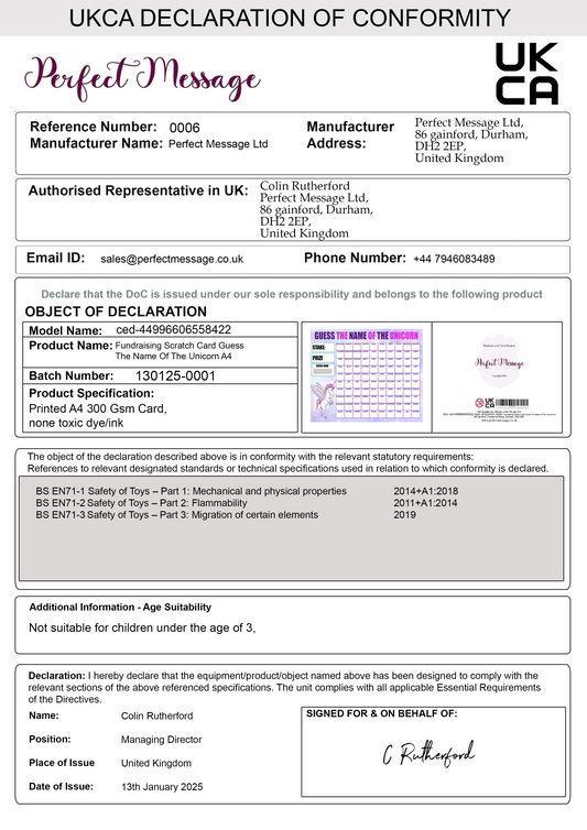 Fundraising Scratch Card Guess The Name Of The UNICORN A4